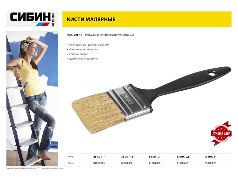 Смешанная щетина обеспечит прекрасное нанесение различных видов ЛКМ, щетина кисти надежно закреплена стальным бандажом, а наличие удобной и лекгой пластмассовой рукоятки обеспечит комфортную работу