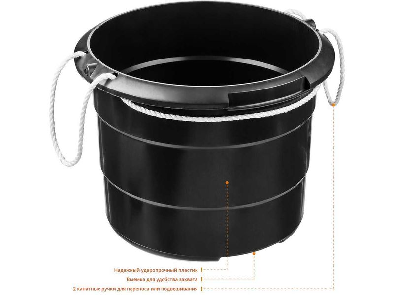 строительная емкость вмещает до 40 литров, подходит для переноски, а также для поднятия на высоту с помощью приспособлений с крюком сухих цементных смесей, песка, щебня и других сыпучих материалов. Различные жидкости можно переносить весом не более 20 кг. Конструкция устойчивая, выполнена из высокопрочного пластика, не потрескается от химического и механического воздействия. Имеет 2 канатные ручки для удобного хвата и подвешивания на крюк