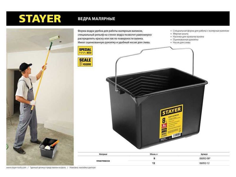 Форма ведра удобна для работы малярным валиком, специальный рельеф на стенке ведра позволит равномерно распределить краску или лак по поверхности валика, а градуировка на стенке повышает точность подбора цвета при смешивании лакокрасочных материалов. Имеет оцинкованную рукоятку и удобный носик для слива.