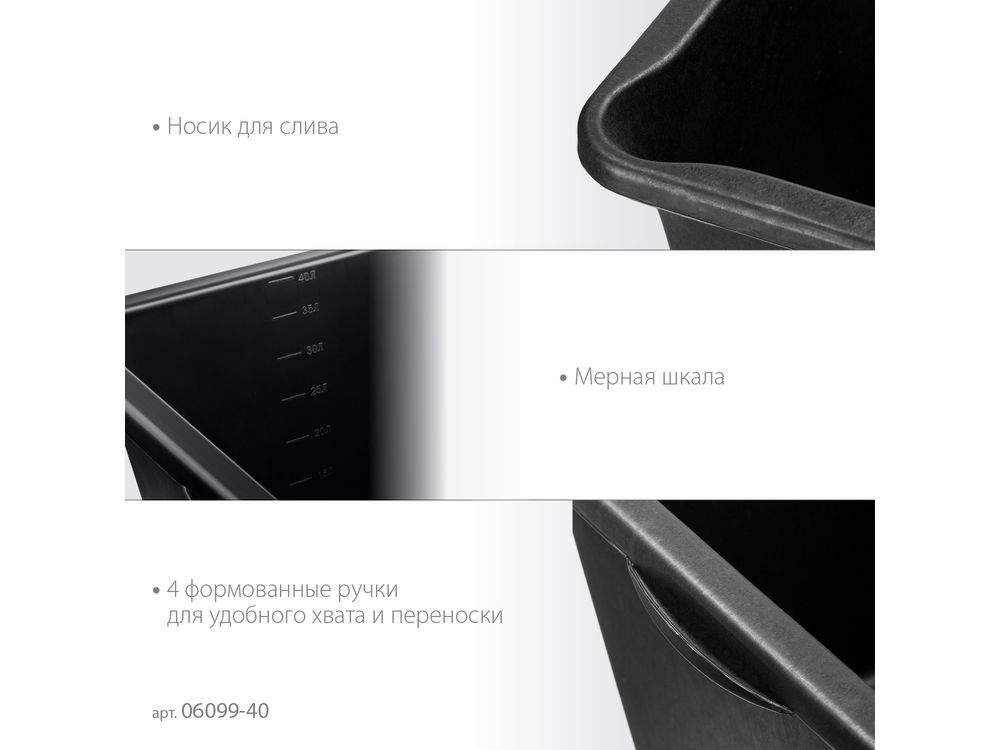 Таз строительный подходит для приготовления любых видов строительных растворов(клеевых, штукатурных, лакокрасочных). Выполнен из высокопрочного морозостойкого пластика, устойчивого к химическому и механическому воздействиям. Имеет устойчивую конструкцию и 4 формованные ручки для удобного хвата и переноски
