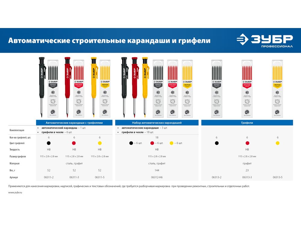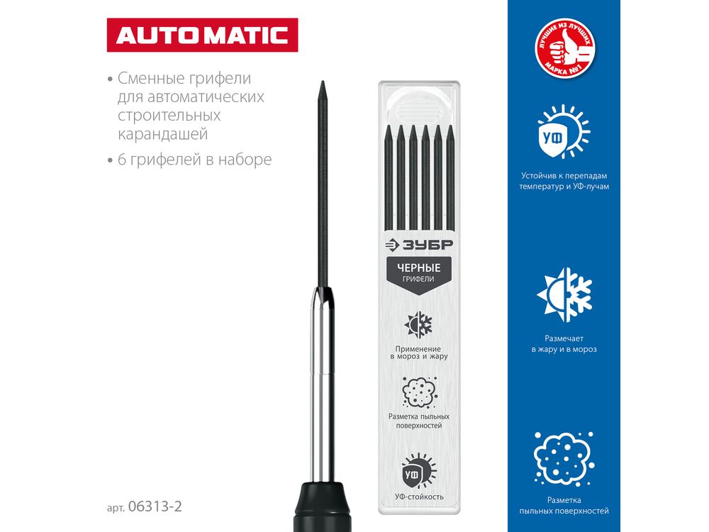 Сменные грифели для автоматического строительного карандаша ЗУБР, 6шт черные, серия Профессионал |