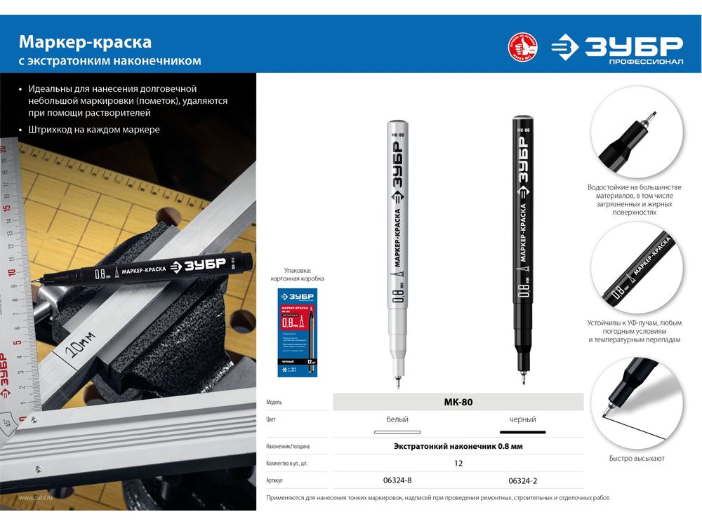 ЗУБР МК-80 белый, 0.8 мм экстра тонкий маркер-краска