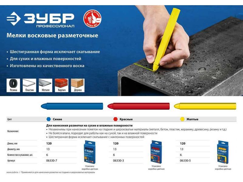 МВР желтые, мелки восковые разметочные, 6 шт, ЗУБР-932