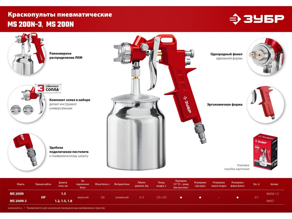Краскопульт ЗУБР МС Н200+ пневматический - универсальный надежный инструмент для проведения окрасочных работ, обеспечивающий производственный процесс большим ресурсом работы.
