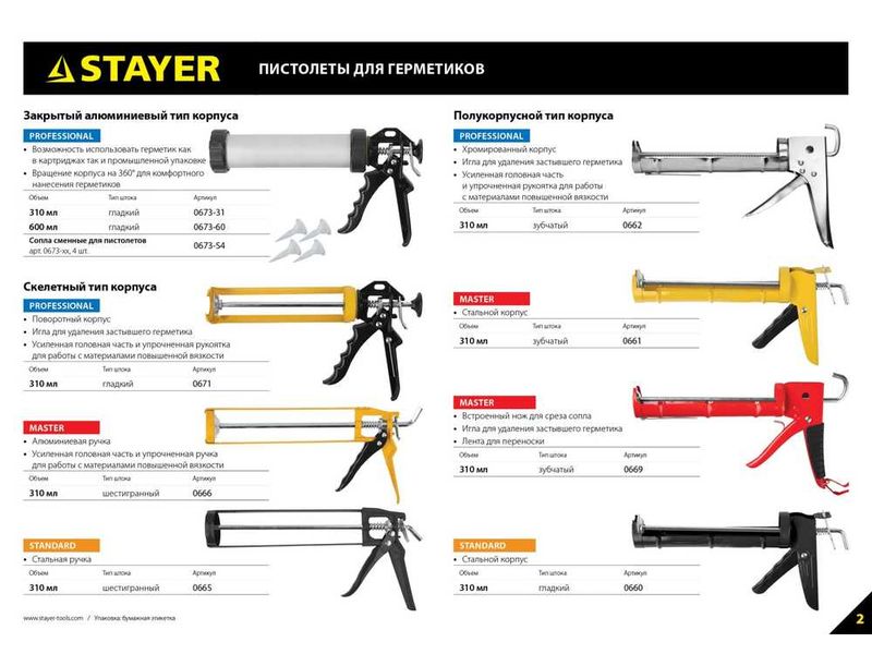 Пистолет для герметиков подходит для работы с картриджами объемом 310 мл, имеет полуоткрытый крашенный стальной корпус, зубчатый шток из оцинкованной стали способствуют равномерной подачи клея либо герметика. Данная спецификация обеспечивает прочность и надежность конструкции пистолета при использовании.