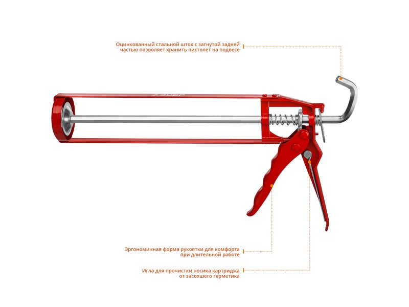 Пистолет для герметиков подходит для работы с картриджами объемом 310 мл, имеет скелетную конструкцию,Оснащен шестигранным штоком и ручкой из алюминиевого сплава, которые способствуют равномерной подачи клея либо герметика. Данная спецификация обеспечивает прочность и надежность конструкции пистолета при использовании. Оснащен иглой для удаления застывшего герметика/клея.