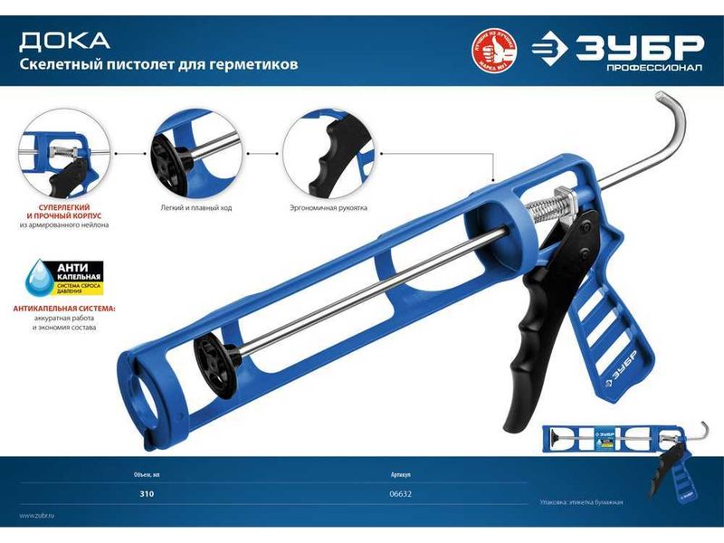 ЗУБР скелетный пистолет для герметика ДОКА, антикапельная система, 310 мл. Серия Профессионал