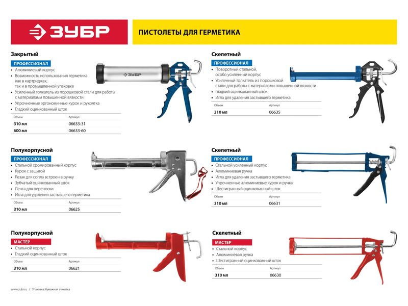 Пистолет для герметиков ЗУБР подходит для работы с герметиками без упаковки (в промышленной упаковке), в алюминиевой фольге и пластиковых картриджах объемом до 600 мл, позволяет осуществить прямой забор материала в корпус пистолета, эргономичная форма рукоятки создает комфортные условия работы, а усиленный толкатель позволяет работать с составами любой вязкости. Изготовлен из особопрочных материалов. Оснащен иглой для удаления застывшего герметика/клея.