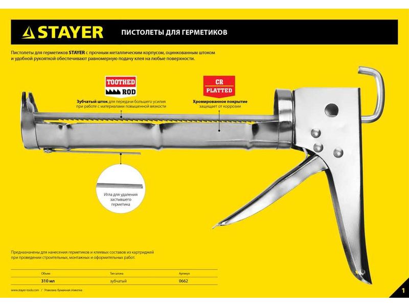 Пистолет для герметиков подходит для работы с картриджами объемом 310 мл, имеет усиленную скелетную конструкцию из стали, ручку из алюминиевого сплава, которые способствуют равномерной подачи клея либо герметика. Данная спецификация обеспечивает прочность и надежность конструкции пистолета при использовании.