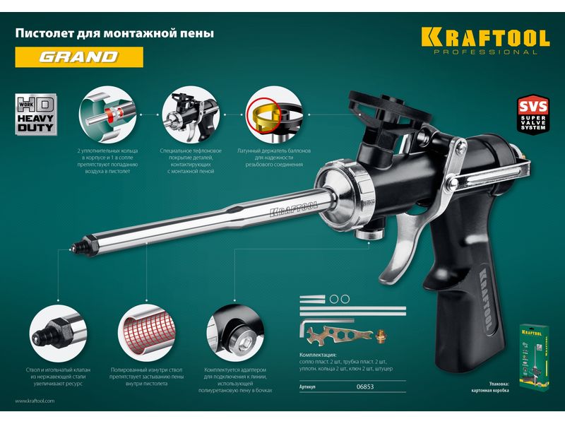 Пистолет для монтажной пены GRAND – инновационный профессиональный инструмент, предназначенный для индустриального применения, отличающийся непревзойдённой герметичностью, высокой надёжностью и удобством в работе. Инструмент оснащён надёжным цельнометаллическим корпусом и имеет покрытый тефлоном игольчатый клапан, это обеспечивает быструю и простую очистку, что высоко ценится профессионалами. При использовании с профессиональными баллонами обеспечивает многократно увеличенный выход пены по сравнению со стандартной упаковкой. При этом отсутствует эффект вторичного расширения.