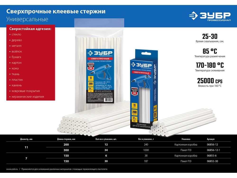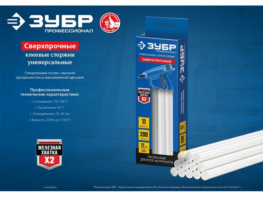 ЗУБР Профессионал прозрачные сверхпрочные клеевые стержни, d 7 х 150 мм (7-8 мм) 6 шт. 38 г-726