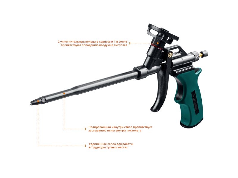 Ствол и игольчатый клапан из нержавеющей стали увеличивают ресурс инструмента. Полированный изнутри ствол препятствует застыванию пены внутри пистолета