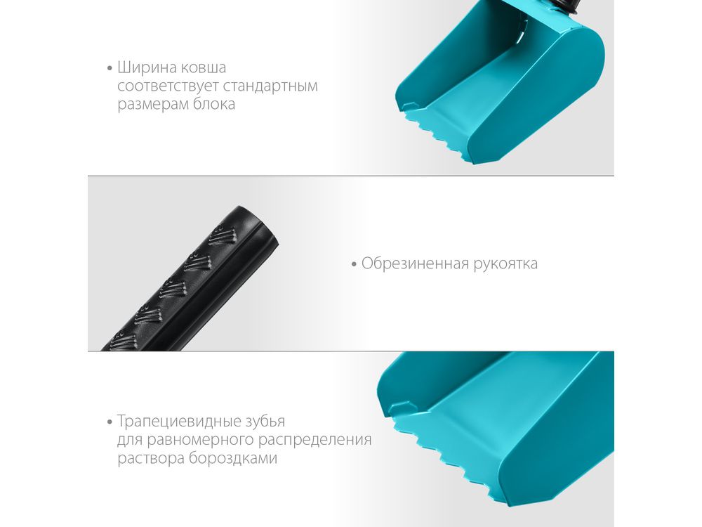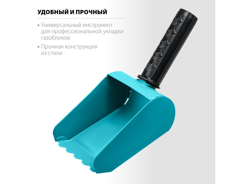 Универсальная металлическая КЕЛЬМА-КОВШ для профессиональной укладки газоблоков, обрезиненая рукоятка, из стали 1,3 мм. Прочная сварная конструкция. Специальные зубья для создания ровных трапециевидных бороздок из раствора.