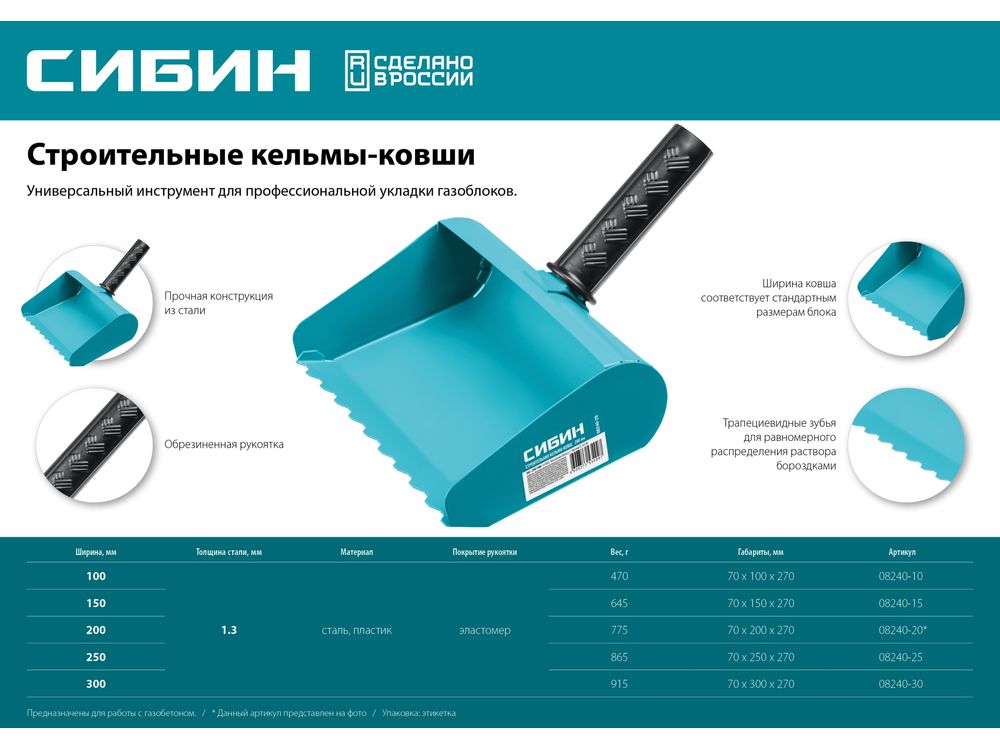 Строительная кельма-ковш СИБИН 100 мм, резиновая рукоятка, 270 мм, сталь 1,3 мм