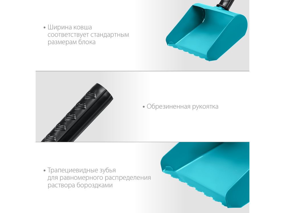 Универсальная металлическая КЕЛЬМА-КОВШ для профессиональной укладки газоблоков, обрезиненая рукоятка, из стали 1,3 мм. Прочная сварная конструкция. Специальные зубья для создания ровных трапециевидных бороздок из раствора.