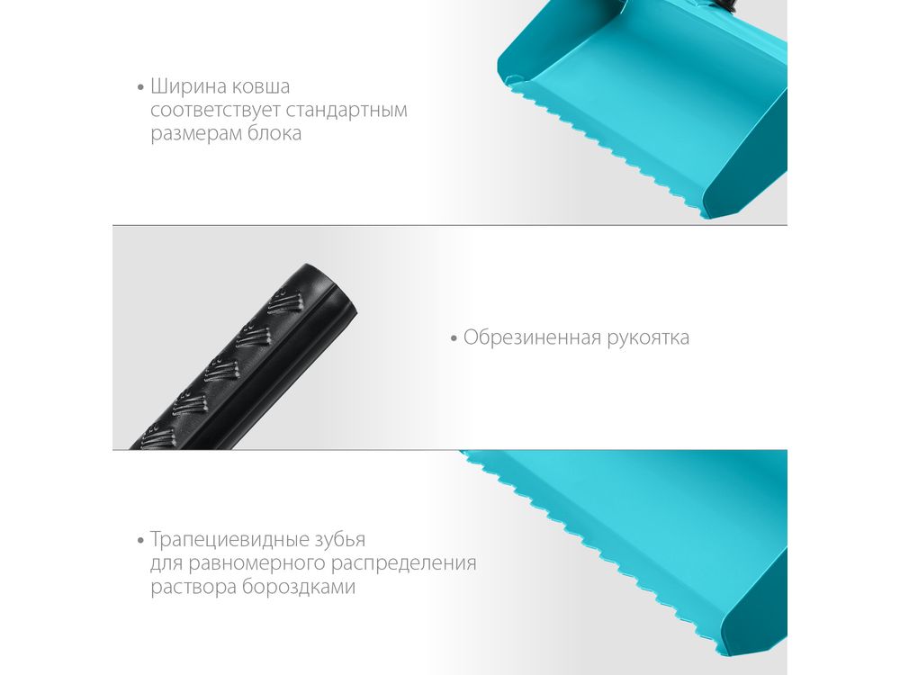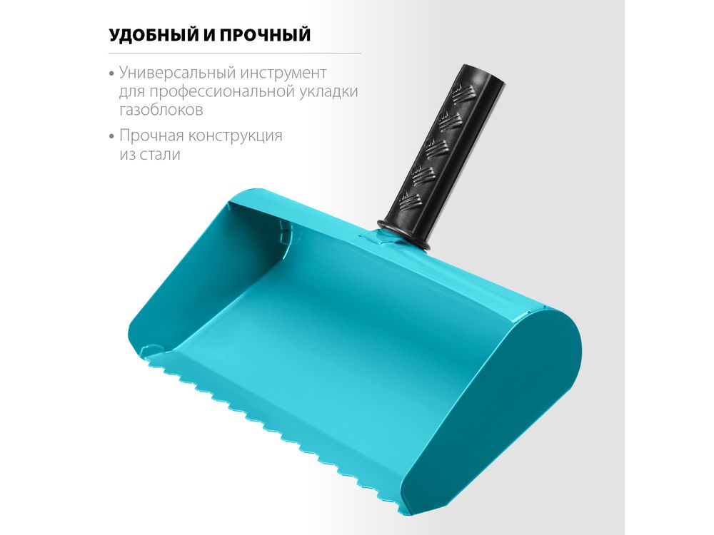 Универсальная металлическая КЕЛЬМА-КОВШ для профессиональной укладки газоблоков, обрезиненая рукоятка, из стали 1,3 мм. Прочная сварная конструкция. Специальные зубья для создания ровных трапециевидных бороздок из раствора.