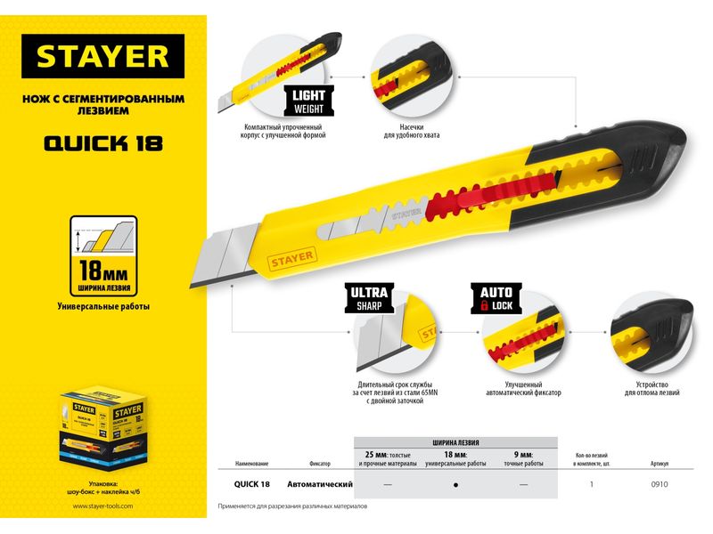 Купить Нож из АБС пластика QUICK-18, сегмент. лезвия 18 мм, STAYER