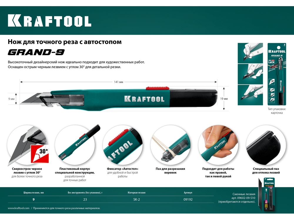 Нож для точного реза с автостопом GRAND-9, сегмент. лезвия 9 мм, KRAFTOOL
