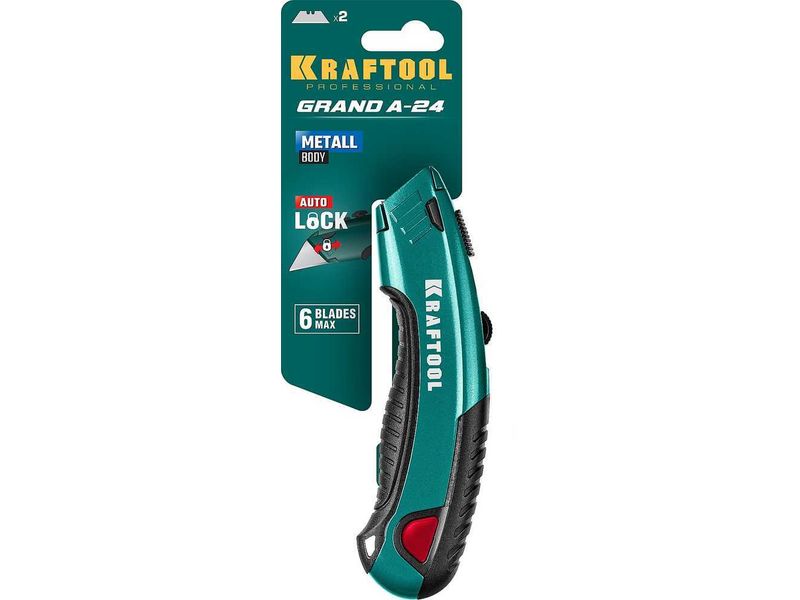 KRAFTOOL GRAND-24, универсальный нож с автостопом, 2 трап. лезвия А24-413