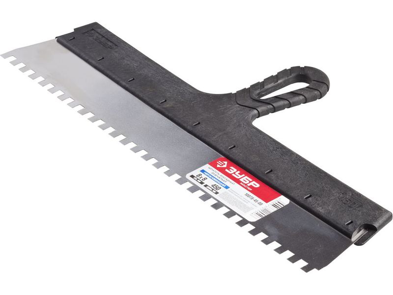 Благодаря зубчатой кромке шпатель идеально подходит для работы со строительными и клеевыми смесями, полотно из нержавеющей стали обеспечивает надежность и долгий срок службы инструмента, а удобная пластмассовая рукоятка создает условия для комфортной работы