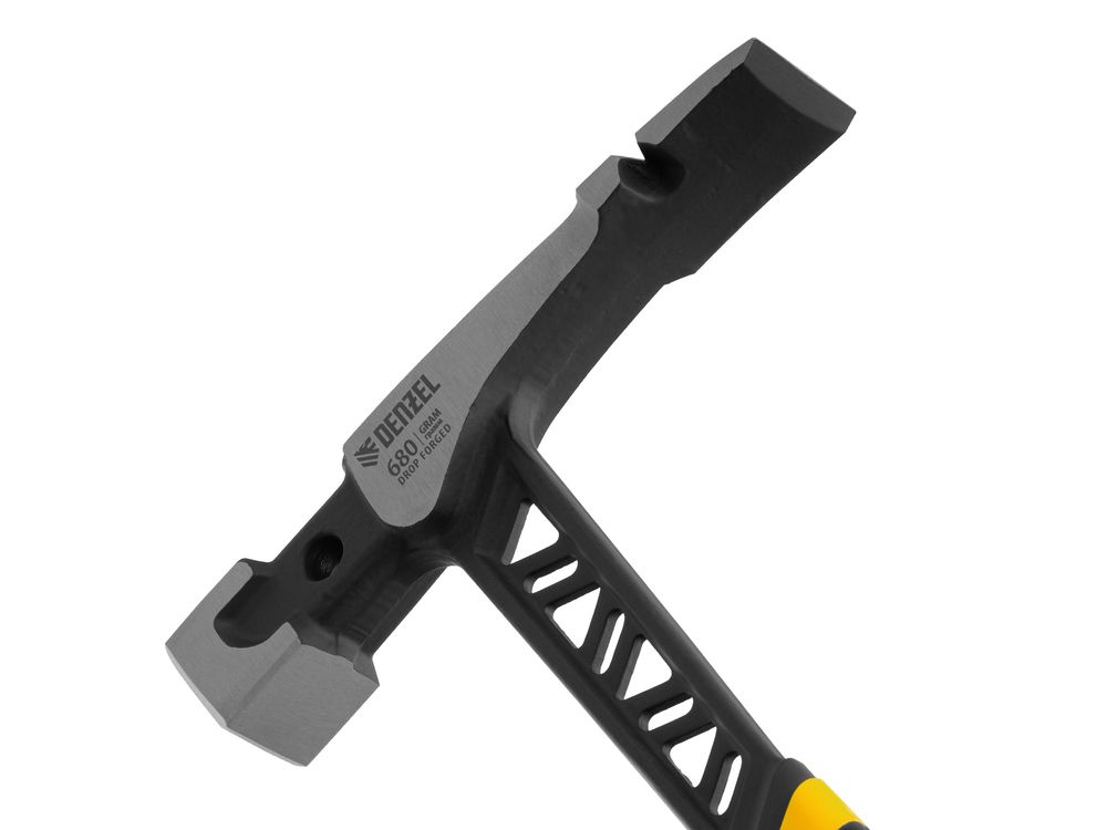 Цельнокованый молоток каменщика Denzel 10633 с бойком весом 680 г, с двухкомпонентной обрезиненной рукояткой, используется для выполнения работ с каменной или кирпичной кладкой. Квадратный боек предназначен для нанесения ударов, а удлиненный заточенный носок — для разрубания камня или кирпича. Гвоздодер применяется для выпрямления небольших гвоздей.