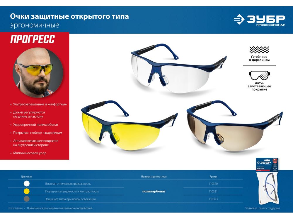 Купить Защитные серые очки ЗУБР ПРОГРЕСС линза устойчива к царапинам и запотеванию, открытого типа