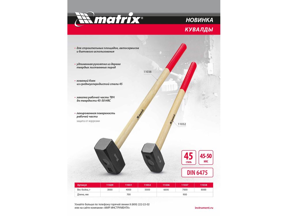 Кувалда Matrix 11032 длиной 700 мм, с кованой головкой весом 5000 г и деревянной рукояткой, — ударный инструмент, позволяющий демонтировать бетонные, каменные и кирпичные конструкции, а также проводить сборочные работы. Удлиненная рукоятка повышает силу наносимых ударов, кованая головка обеспечивает надежность и долговечность инструмента. Кувалда применяется при проведении строительных работ, будет полезна в гараже или на загородном участке.