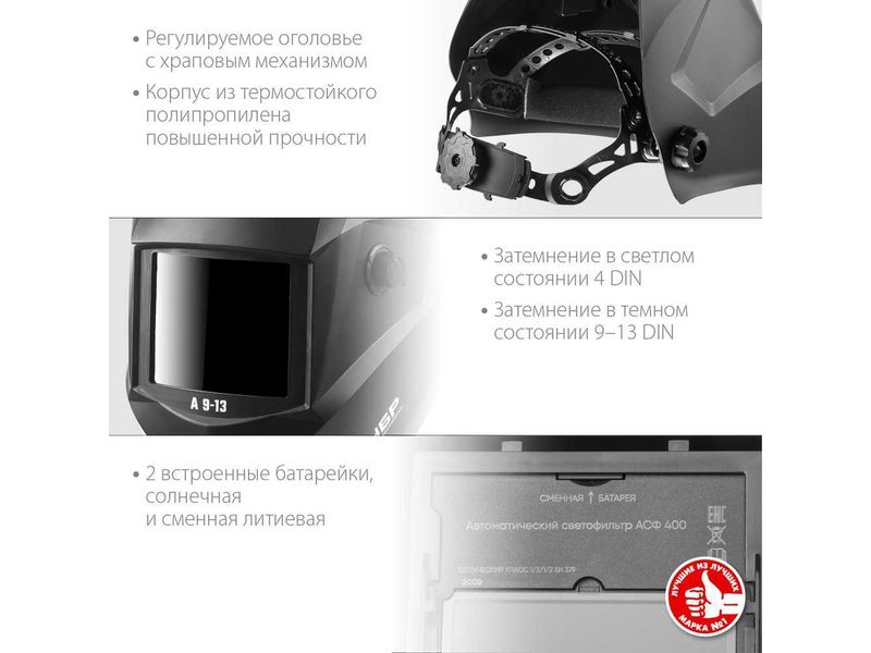 Степень затемнения: 9–13 DIN, в светлом состоянии: 4 DIN