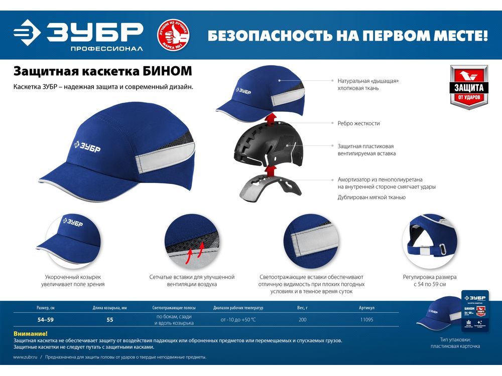 Купить Защитная каскетка ЗУБР БИНОМ ударопрочный корпус, козырёк 55мм, размер от 54 до 59см