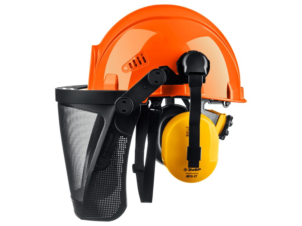 Защитная каска ЗУБР ТРИАДА наушники SNR-27дБ, сетчатый экран 190х339мм, в комплекте с наушниками и защитным экраном
