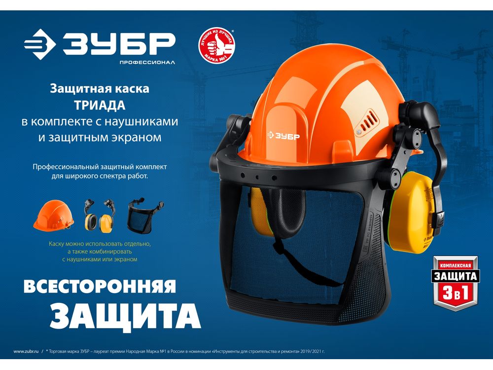 Средства защиты трудаКаски защитные Защитная каска ЗУБР ТРИАДА наушники SNR-27дБ, сетчатый экран 190х339мм, в комплекте с наушниками и защитным экраном-532