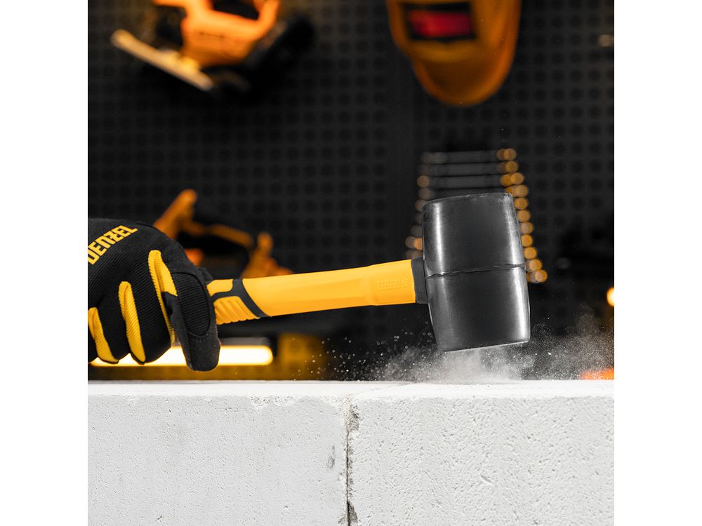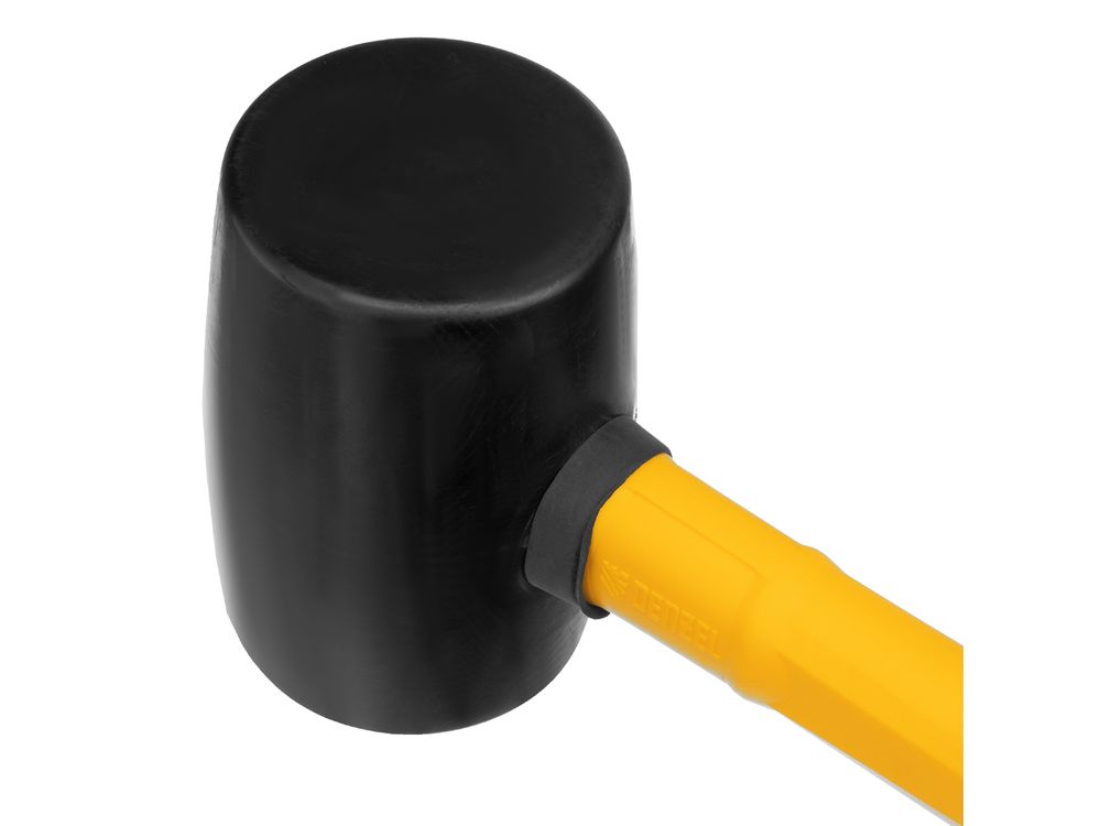 Резиновая киянка Denzel 11144 с бойком из черной резины весом 450 г и фибергласовой рукояткой с TPR-покрытием, применяется при проведении монтажных, сборочных и кузовных работ, укладки плитки. Инструмент характеризуется высокой прочностью и стойкостью к агрессивному воздействию, подходит для профессионального использования.