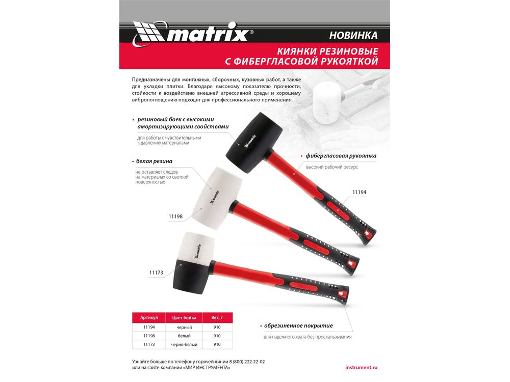 Резиновая киянка Matrix 11198 из белой резины с фибергласовой рукояткой, 910 г, применяется при проведении монтажных, сборочных и кузовных работ, укладке плитки. Резиновый боек обладает высокими амортизирующими свойствами, что делает его оптимальным для работы с чувствительными к давлению материалами.