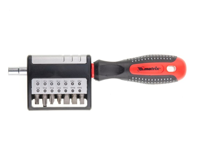 Отвертка Matrix 11337 с набором из 14 бит из стали CrV служит для откручивания и закручивания резьбового крепежа со шлицами SL, PH, PZ и Torx. Заменяет комплект стандартных отверток. Присоединительный шестигранник с магнитом надежно удерживает биту, не давая ей выскочить во время работы. Набор подходит для профессионального и бытового применения.