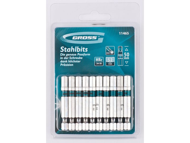 Набор бит Gross 11465 состоит из 10 сменных насадок HEX 6 х 50 мм с шестигранным хвостовиком 1/4 дюйма, изготовленных из стали S2, которые используются в качестве оснастки на шуруповертах. Биты типоразмера HEX6 предназначены для монтажа и демонтажа мебельных и велосипедных евровинтов. Шестигранный шлиц обеспечивает большую площадь соприкосновения с крепежом, что позволяет увеличить крутящий момент без риска повреждения биты.