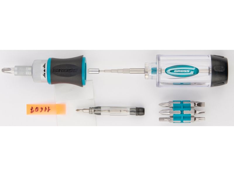 Набор Gross 11607 включает в себя реверсивную отвертку с телескопическим магнитным стержнем, мини-отвертку, сменные насадки из стали S2 — 11 бит 1/4 дюйма и 2 двусторонние биты для точных работ. Инструменты предназначены для монтажа/демонтажа крепежных элементов со шлицами PH, SL, TORX и HEX. Отвертка пригодится как частным мастерам, так и профессионалам при выполнении монтажных, строительных и ремонтных работ. При необходимости вместе с отверткой можно использовать любые насадки длиной 25 мм — как биты с хвостовиком 1/4 дюйма, так и биты для точных работ.