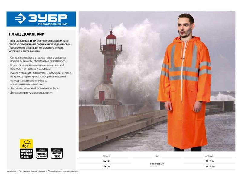 Плащ-дождевик ЗУБР отличается высоким качеством изготовления и повышенной надежностью. Превосходно защищает от сильного дождя, устойчив к загрязнениям и разрывам.