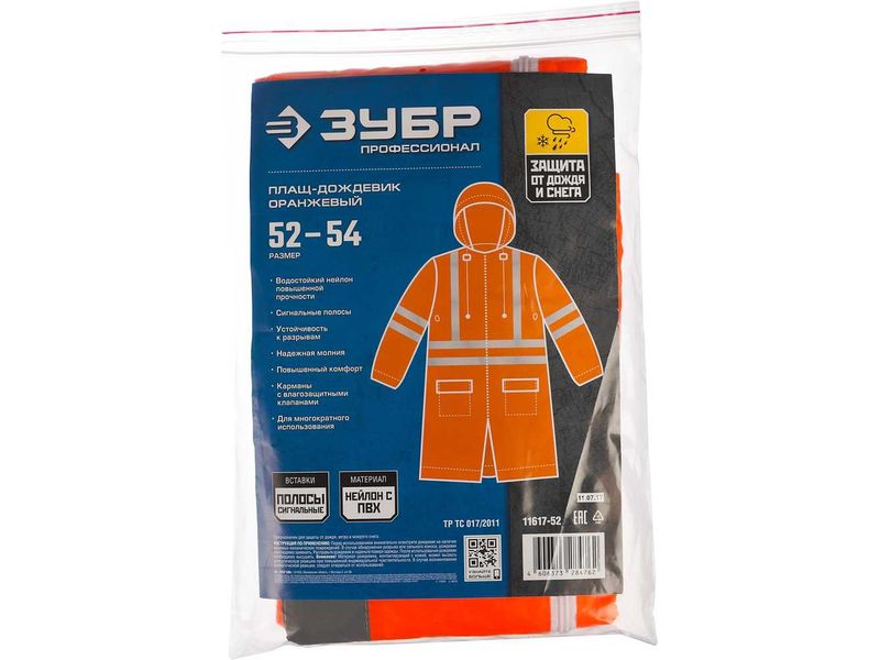 Купить Плащ-дождевик ЗУБР 11617-52, сигнальный цвет, нейлоновый на молнии, размер 52-54
