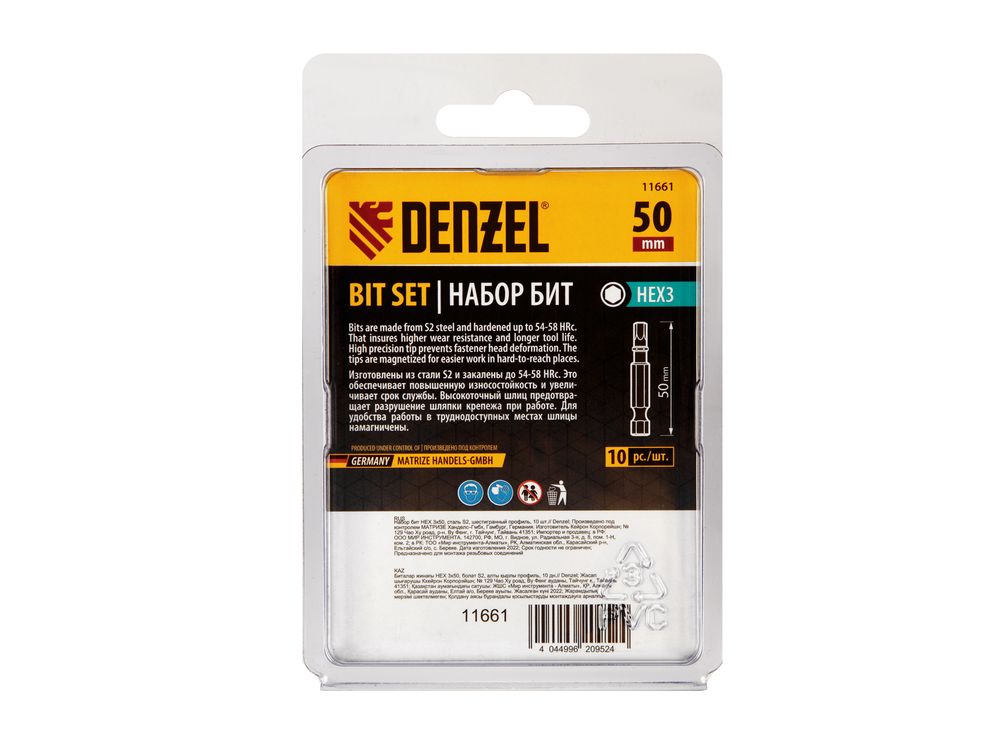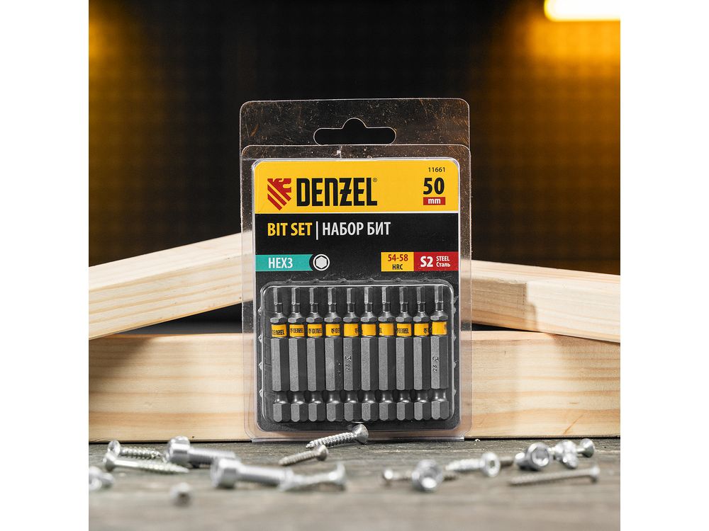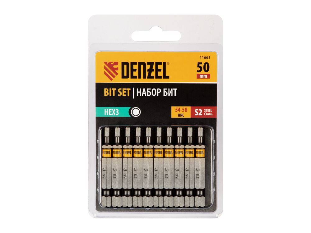 Набор бит HEX 3 х 50 мм Denzel 11661 включает в себя 10 сменных насадок из стали S2, с шестигранным хвостовиком 1/4, которые используются в качестве оснастки на шуруповертах. Биты типоразмера HEX3 предназначены для монтажа и демонтажа мебельных и велосипедных евровинтов. Шестигранный шлиц обеспечивает большую площадь соприкосновения с крепежом, что позволяет увеличить крутящий момент без риска повреждения биты. Длина насадок 50 мм позволяет с удобством работать в ограниченном пространстве и в труднодоступных местах.