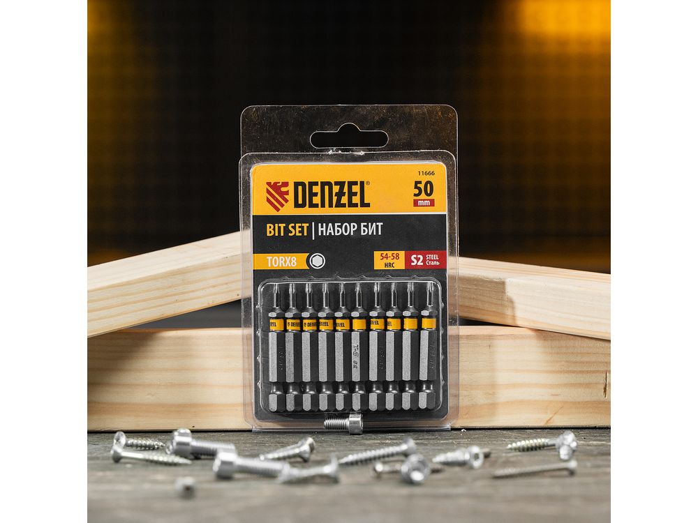 Набор бит TORX 8 х 50 мм Denzel 11666 включает в себя 10 насадок с хвостовиком 1/4, из стали S2, для работы с шуруповертами. Шлиц в форме звезды служит для быстрого монтажа и демонтажа винтов при сборке бытовой техники и электроприборов. Набор универсален и подходит как для бытового, так и для профессионального применения. Благодаря конструктивной особенности лучи «звезды» надежно сцепляются с крепежом, нагрузка равномерно распределяется на все грани, это снижает риск соскальзывания биты и обеспечивает высокую точность работ.