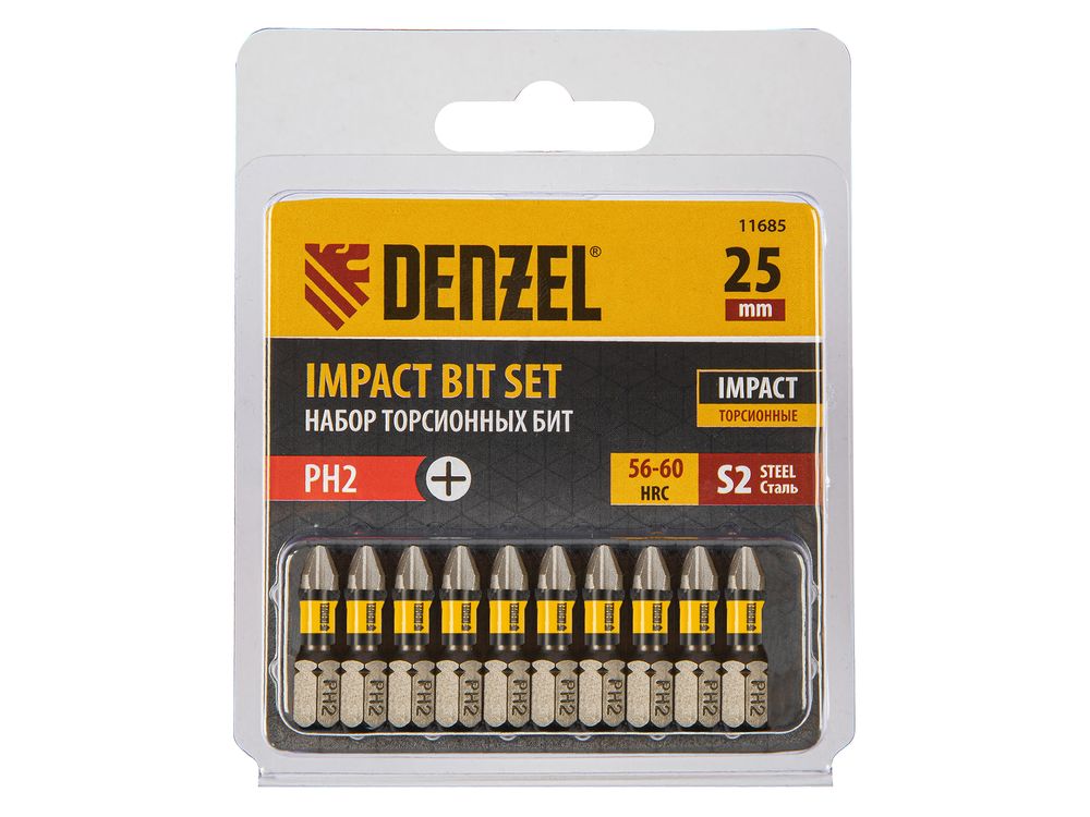 Набор бит торсионных PH2 x 25 мм Denzel 11685 с лазерной обработкой шлица, из стали S2, 10 шт., предназначен для монтажа и демонтажа резьбовых соединений с помощью ударного шуруповерта. Он незаменим в строительных, слесарных и монтажных работах, в автосервисах, при проведении ремонта в доме.,Торсионная зона способна пружинить, за счет чего она частично амортизирует тангенциальный удар от шуруповерта. Такое решение позволяет равномерно распределить нагрузку по бите, избежать поломки шлица и в разы увеличить объем работы, проделанный одной насадкой.