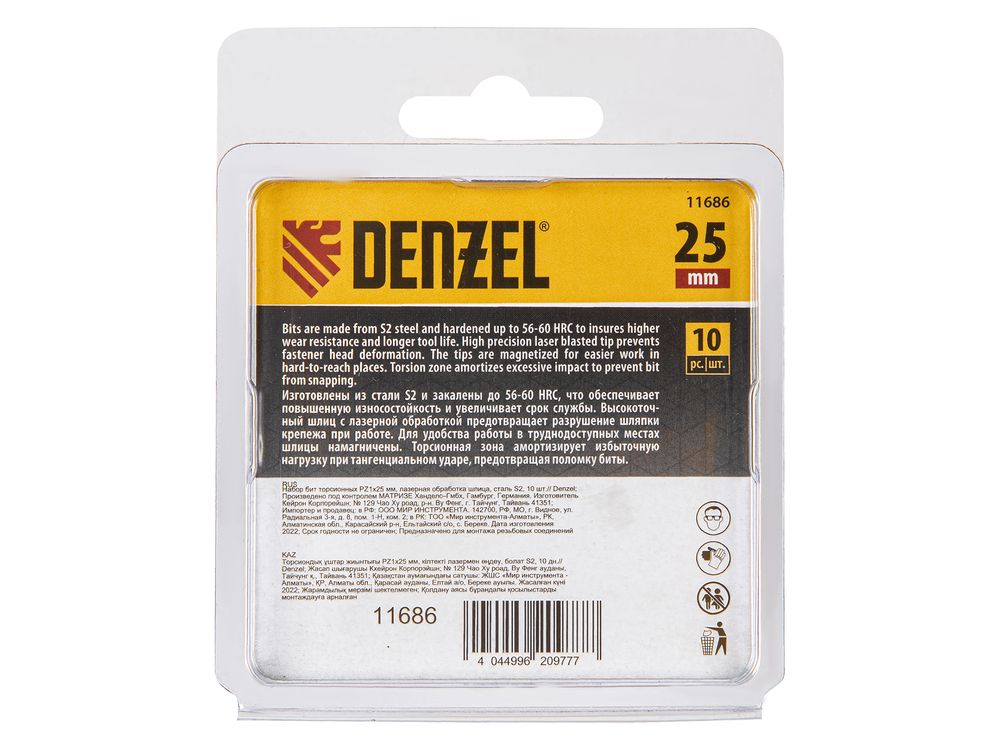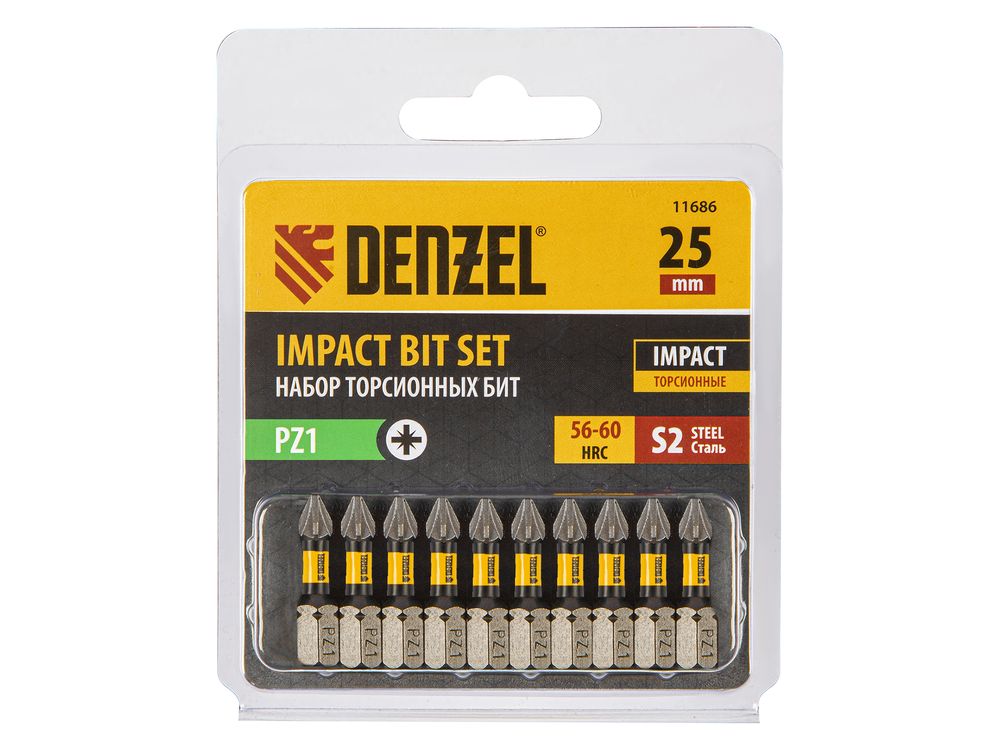 Набор бит торсионных PZ1 x 25 мм Denzel 11686 с лазерной обработкой шлица, из стали S2, 10 шт., предназначен для монтажа и демонтажа резьбовых соединений с помощью ударного шуруповерта. Он незаменим в строительных, слесарных и монтажных работах, в автосервисах, при проведении ремонта в доме.,Торсионная зона способна пружинить, за счет чего она частично амортизирует тангенциальный удар от шуруповерта. Такое решение позволяет равномерно распределить нагрузку по бите, избежать поломки шлица и в разы увеличить объем работы, проделанный одной насадкой.