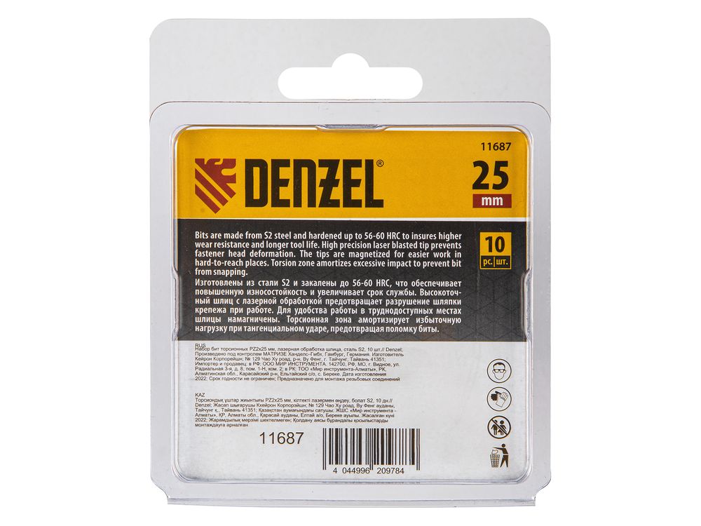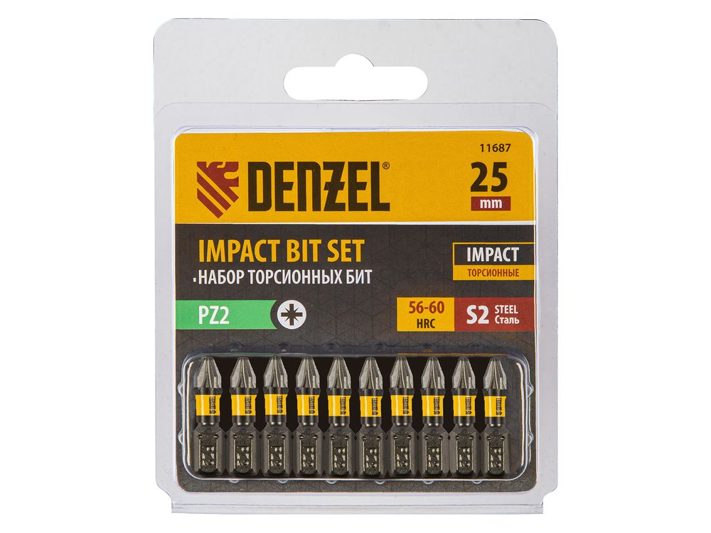 Набор бит торсионных PZ2 x 25 мм Denzel 11687 с лазерной обработкой шлица, из стали S2, 10 шт., предназначен для монтажа и демонтажа резьбовых соединений с помощью ударного шуруповерта. Он незаменим в строительных, слесарных и монтажных работах, в автосервисах, при проведении ремонта в доме.,Торсионная зона способна пружинить, за счет чего она частично амортизирует тангенциальный удар от шуруповерта. Такое решение позволяет равномерно распределить нагрузку по бите, избежать поломки шлица и в разы увеличить объем работы, проделанный одной насадкой.