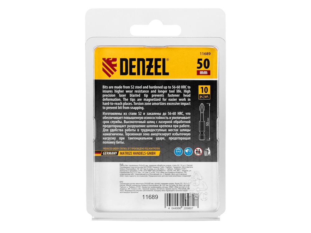 Набор бит торсионных PH2 x 50 мм Denzel 11689 с лазерной обработкой шлица, из стали S2, 10 шт., предназначен для монтажа и демонтажа резьбовых соединений с помощью ударного шуруповерта. Он незаменим в строительных, слесарных и монтажных работах, в автосервисах, при проведении ремонта в доме.,Торсионная зона способна пружинить, за счет чего она частично амортизирует тангенциальный удар от шуруповерта. Такое решение позволяет равномерно распределить нагрузку по бите, избежать поломки шлица и в разы увеличить объем работы, проделанный одной насадкой.