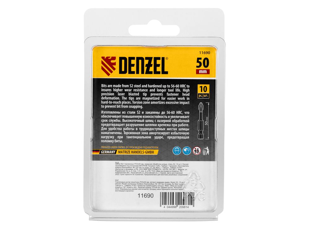 Набор бит торсионных PH3 x 50 мм Denzel 11690 с лазерной обработкой шлица, из стали S2, 10 шт., предназначен для монтажа и демонтажа резьбовых соединений с помощью ударного шуруповерта. Он незаменим в строительных, слесарных и монтажных работах, в автосервисах, при проведении ремонта в доме.,Торсионная зона способна пружинить, за счет чего она частично амортизирует тангенциальный удар от шуруповерта. Такое решение позволяет равномерно распределить нагрузку по бите, избежать поломки шлица и в разы увеличить объем работы, проделанный одной насадкой.