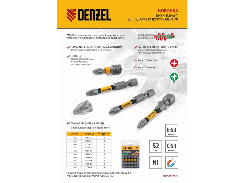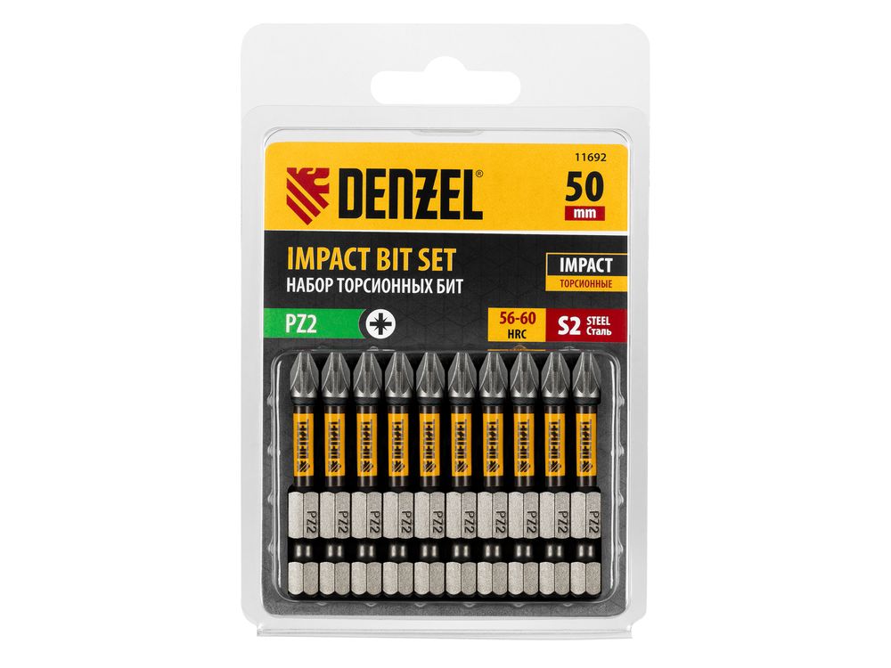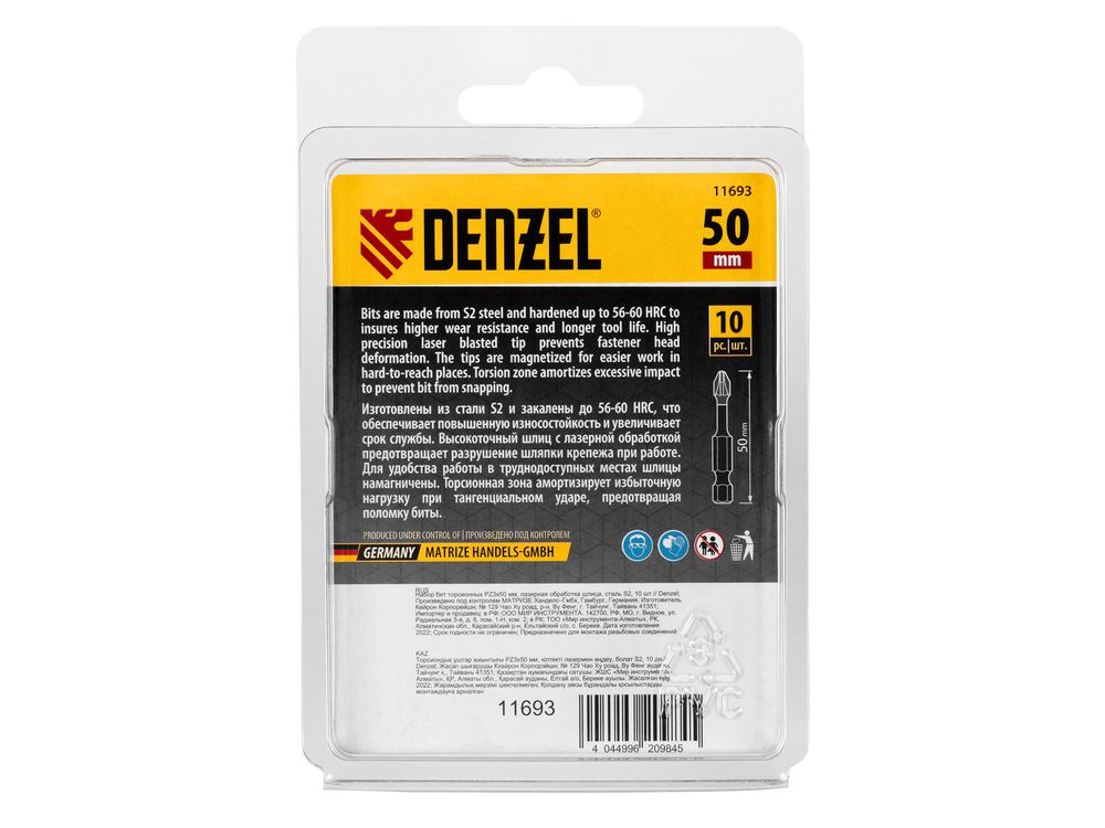 Набор бит торсионных PZ3 x 50 мм Denzel 11693 с лазерной обработкой шлица, из стали S2, 10 шт., предназначен для монтажа и демонтажа резьбовых соединений с помощью ударного шуруповерта. Он незаменим в строительных, слесарных и монтажных работах, в автосервисах, при проведении ремонта в доме.,Торсионная зона способна пружинить, за счет чего она частично амортизирует тангенциальный удар от шуруповерта. Такое решение позволяет равномерно распределить нагрузку по бите, избежать поломки шлица и в разы увеличить объем работы, проделанный одной насадкой.