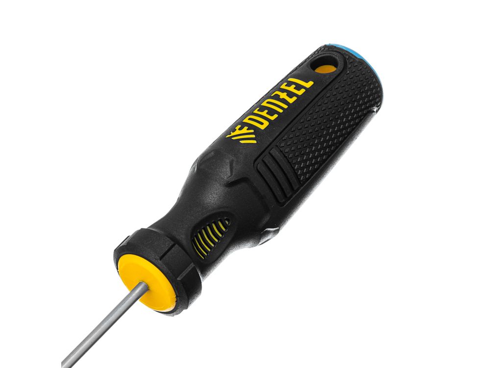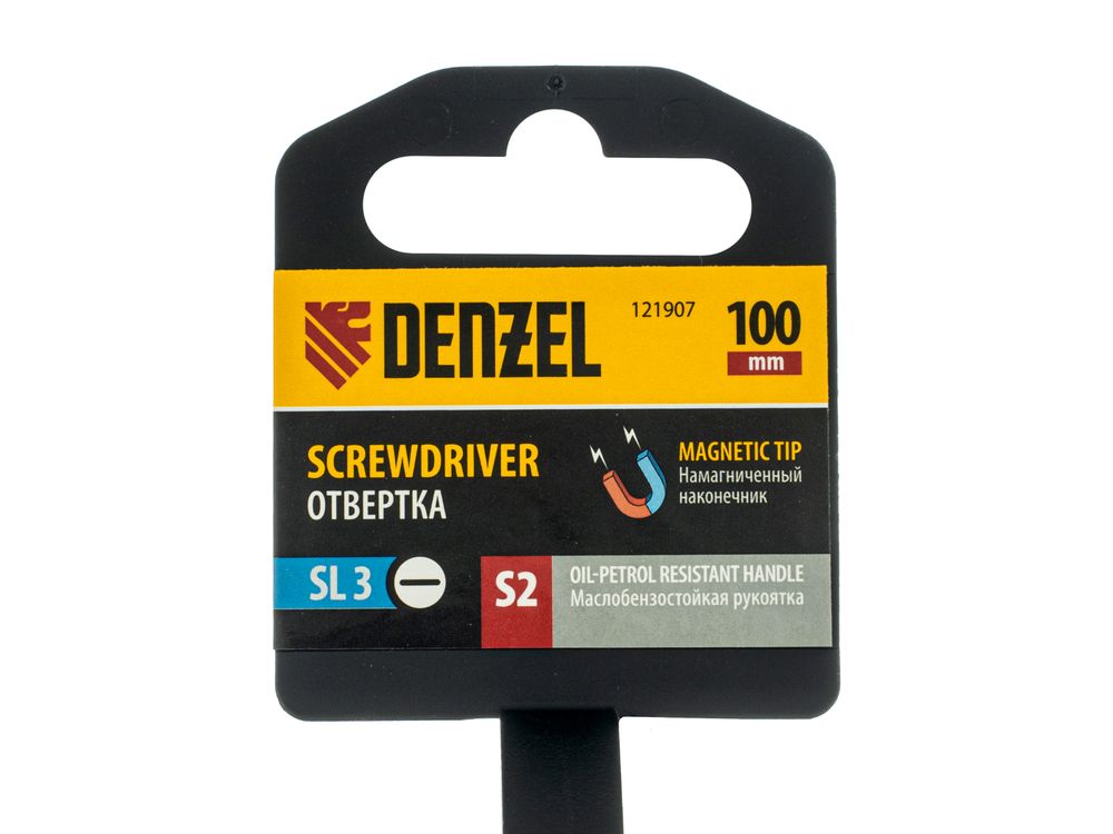 Отвертка Denzel 121907 с трехкомпонентной рукояткой, со стержнем из стали S2, длиной 100 мм, предназначена для монтажа и демонтажа винтов и саморезов с прямым шлицем SL3. Высокоточный намагниченный шлиц крепко фиксируется в головке крепежа. Отвертка выдерживает интенсивное применение, предназначена для выполнения профессиональных ремонтных и монтажных работ.