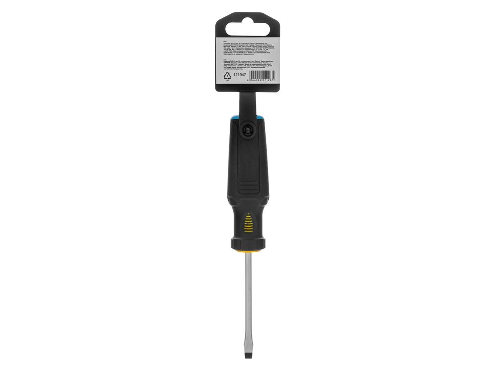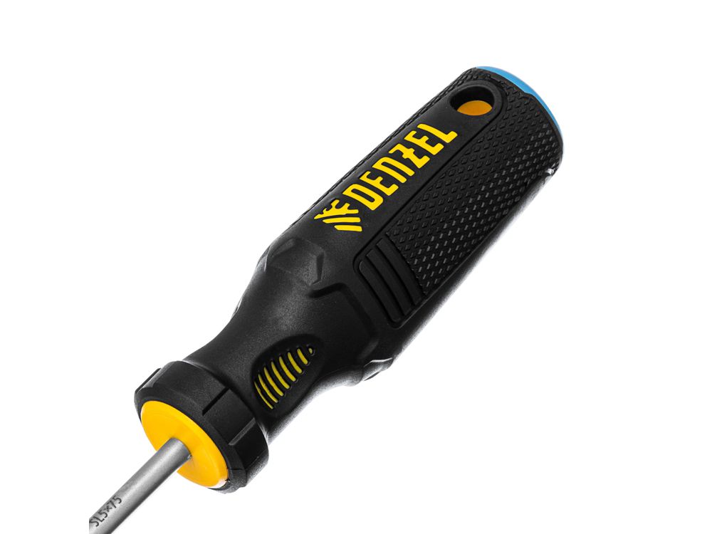 Отвертка Denzel 121947 с трехкомпонентной рукояткой, со стержнем из стали S5, длиной 75 мм, предназначена для монтажа и демонтажа винтов и саморезов с прямым шлицем SL5. Высокоточный намагниченный шлиц крепко фиксируется в головке крепежа. Отвертка выдерживает интенсивное применение, предназначена для выполнения профессиональных ремонтных и монтажных работ.