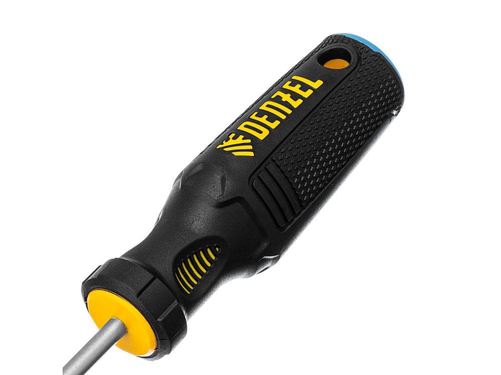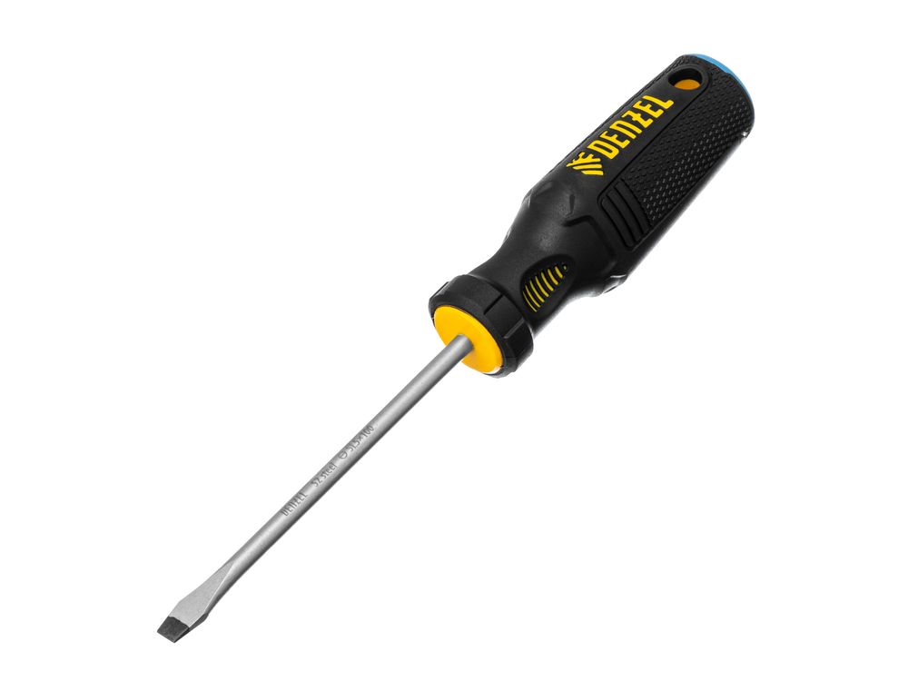 Отвертка Denzel 121967 с трехкомпонентной рукояткой, со стержнем из стали S2, длиной 100 мм, предназначена для монтажа и демонтажа винтов и саморезов с прямым шлицем SL5. Высокоточный намагниченный шлиц крепко фиксируется в головке крепежа. Отвертка выдерживает интенсивное применение, предназначена для выполнения профессиональных ремонтных и монтажных работ.