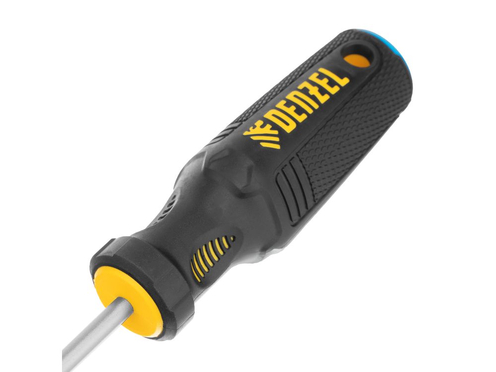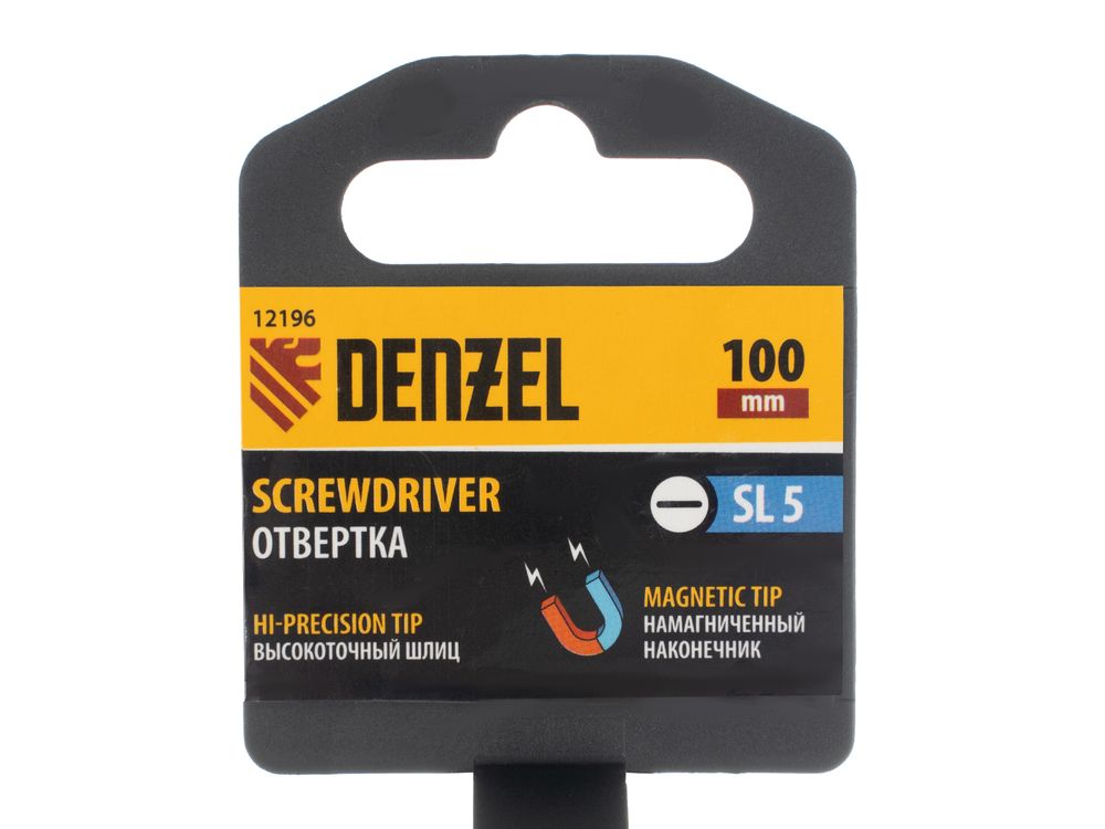 Отвертка SL5 х 100 мм Denzel 12196 из стали CrV, с трехкомпонентной рукояткой, используется для монтажа и демонтажа винтов и саморезов с прямым шлицем Slotted. Намагниченный шлиц крепко фиксируется в головке крепежа. Отвертка выдерживает интенсивное применение и предназначена для выполнения профессиональных ремонтных и монтажных работ.